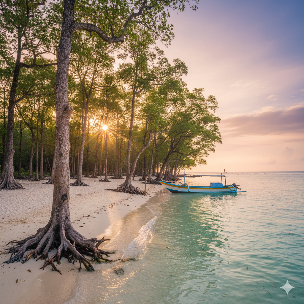 Pantai yang teduh karena ditumbuhi pohon-pohon besar dan hutan mangrove. Dikenal juga sebagai habitat kera. Ideal untuk menikmati matahari terbenam.